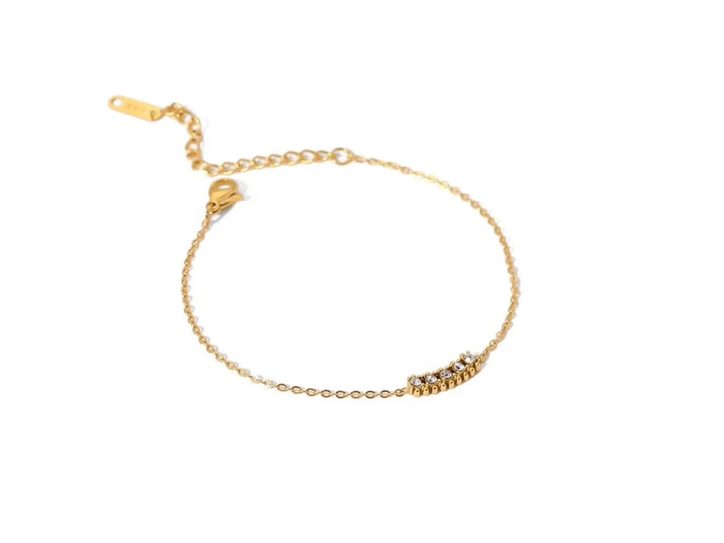 Nádherný pozlacený náramek kombinuje třpytivé kamínky s jemným řetízkem.