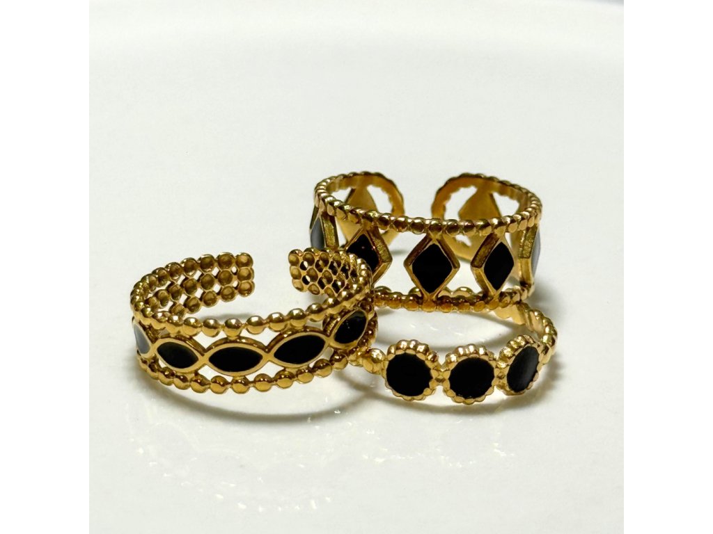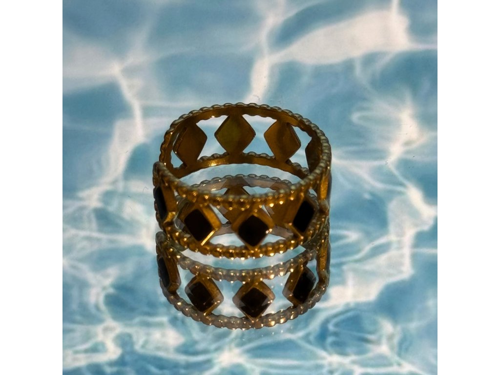 Krásný pozlacený prsten z nerezové oceli s černými detaily.